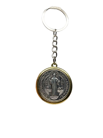 Chaveiro Medalha de São Bento, confeccionado em metal na cor prata e dourado, com medalha de 3 cm de diâmetro em formato plano. De um lado, apresenta a tradicional medalha de São Bento; do outro, a imagem de São Bento, unindo fé, proteção e estilo. O chaveiro inclui corrente e arco, totalizando 10 cm de altura.