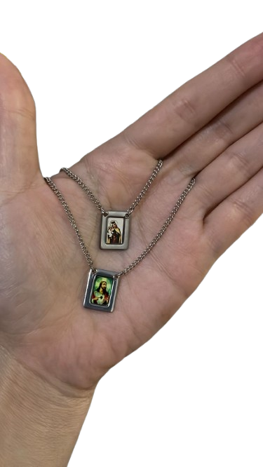 Expresse sua fé com elegância e devoção com este escapulário religioso em aço inoxidável, trazendo de um lado a imagem de Nossa Senhora do Carmo e do outro o Sagrado Coração de Jesus.