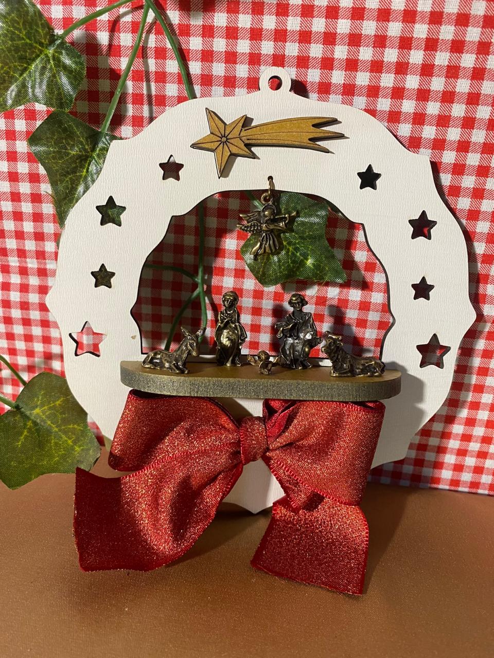 Encanto natalino em cada detalhe. Esta guirlanda é feita em madeira, trazendo no centro um delicado presépio em ferro, unindo tradição e beleza em uma peça única para sua decoração.