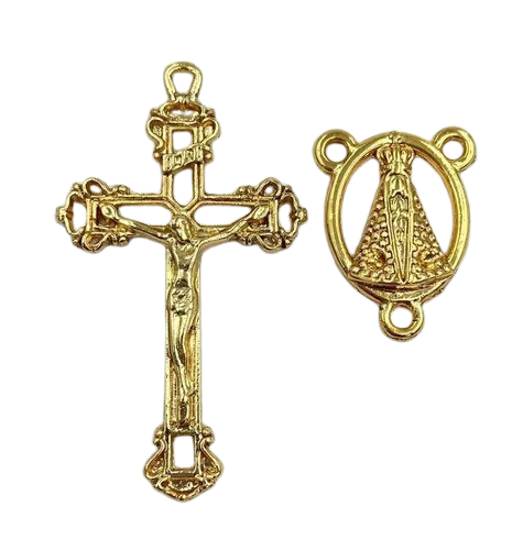 Kit completo para confecção de terços, composto por crucifixo e entremeio com a imagem de Nossa Senhora Aparecida, em acabamento dourado. Ideal para quem deseja criar terços personalizados, lembrancinhas religiosas ou artesanato devocional.