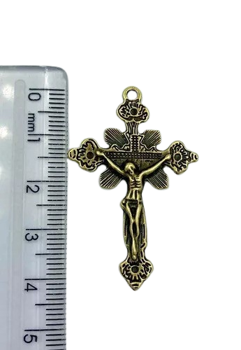 Kit completo para confecção de terços ou lembrancinhas religiosas, composto por crucifixo e entremeio com a imagem de Nossa Senhora Aparecida, em acabamento ouro velho. Ideal para artesanato devocional e criações personalizadas de terços.