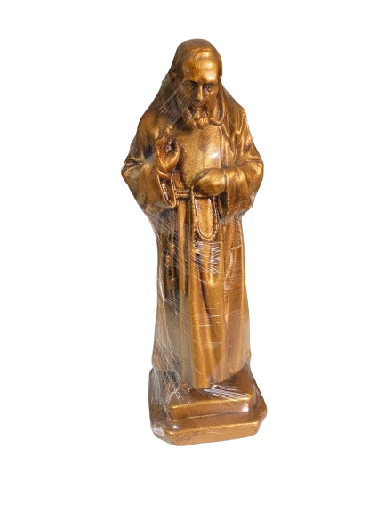 A imagem de São Padre Pio é confeccionada em gesso de alta durabilidade e resistência, com acabamento artesanal e riqueza de detalhes que proporcionam beleza e sofisticação à peça. Ideal para ambientes internos, seja em casa, capela ou altar pessoal.