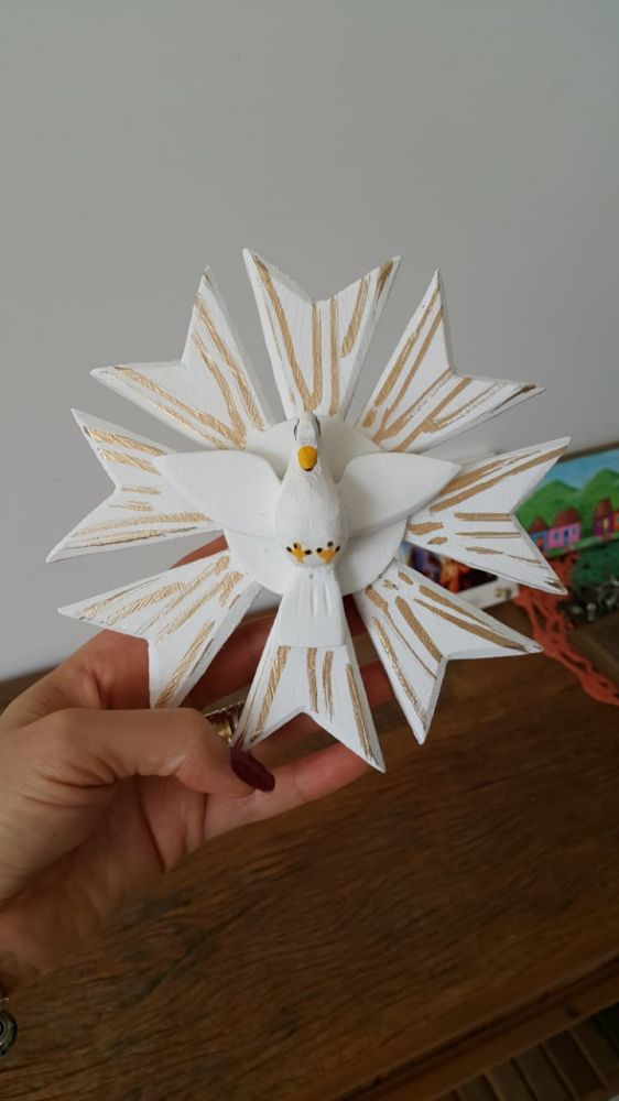 Divino Espírito Santo – Resplendor de Madeira, peça de artesanato mineiro entalhada à mão, com acabamento de alta qualidade. Um símbolo de fé e proteção, perfeito como lembrança para batismo, crisma ou casamento, trazendo espiritualidade e beleza ao ambiente.