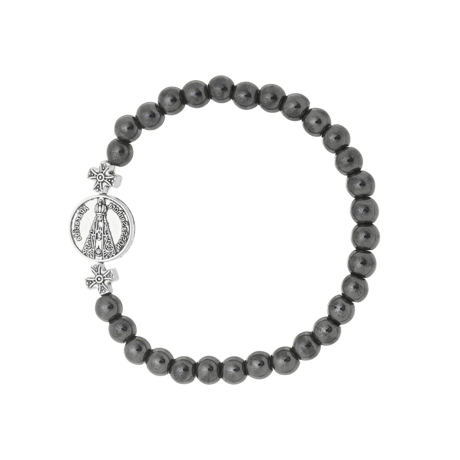 Um dos produtos mais procurados, a trazemos esta lindíssima pulseira de Nossa Senhora Aparecida! Com elástico, o acessório contém a medalha redonda com a figura da Padroeira do Brasil na cor prata, juntamente dos entremeios em formato de cruz. As contas em hematita são na cor chumbo.