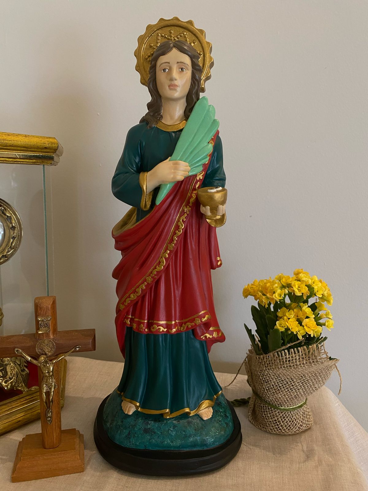 Imagem de Santa Luzia confeccionada em gesso artesanal, pintada à mão com tintas próprias do ateliê, garantindo exclusividade, cores vibrantes e acabamento delicado. Cada peça é produzida com atenção e cuidado, resultando em um artigo devocional único, ideal para oratórios, altares domésticos ou decoração com significado espiritual.